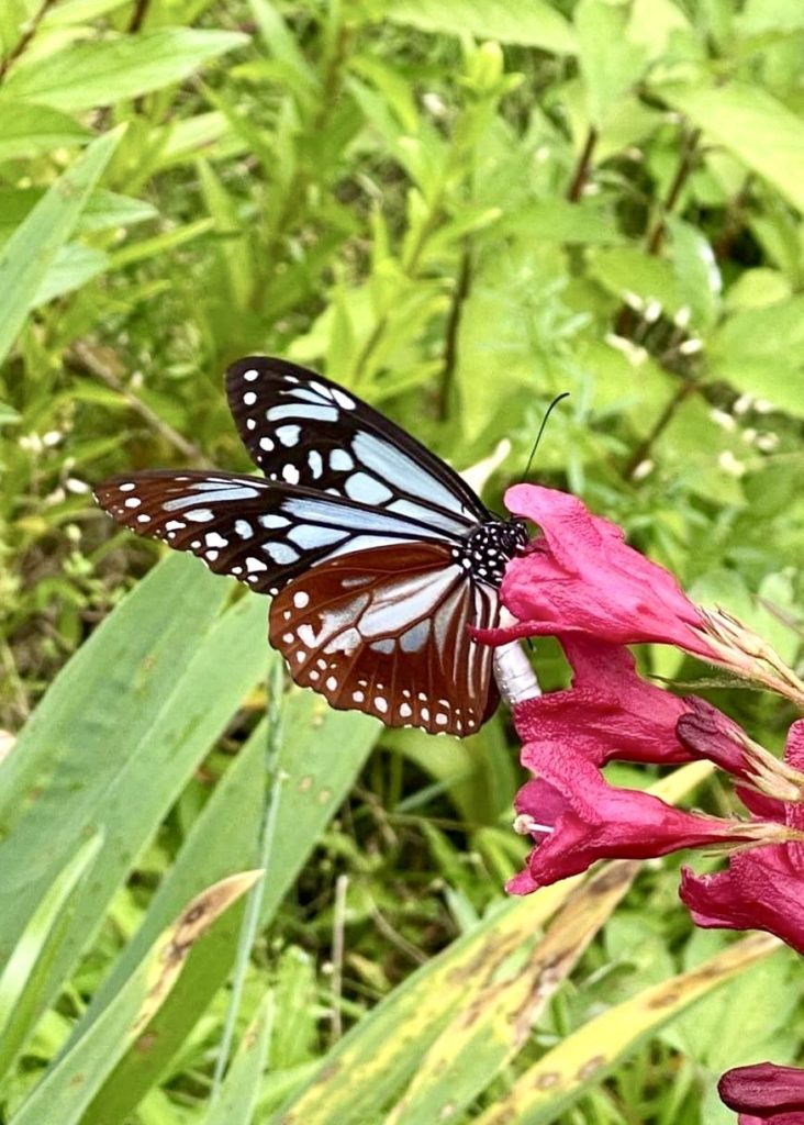 この写真では、初夏のタニウツギの花を訪れていますが、アサギマダラの存続を願う方は、ぜひ秋の七草のひとつ、フジバカマやヒヨドリバナを植えてあげてください。もし近くにアサギマダラがいれば、必ず訪花します。みんなで花の道をつくりましょう。