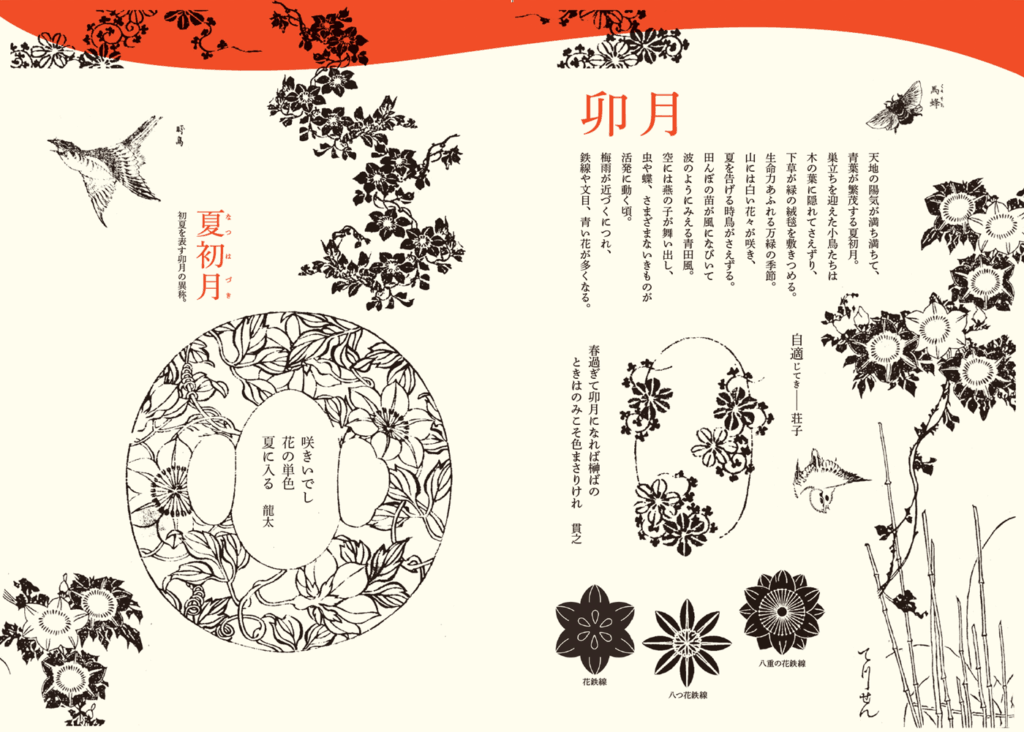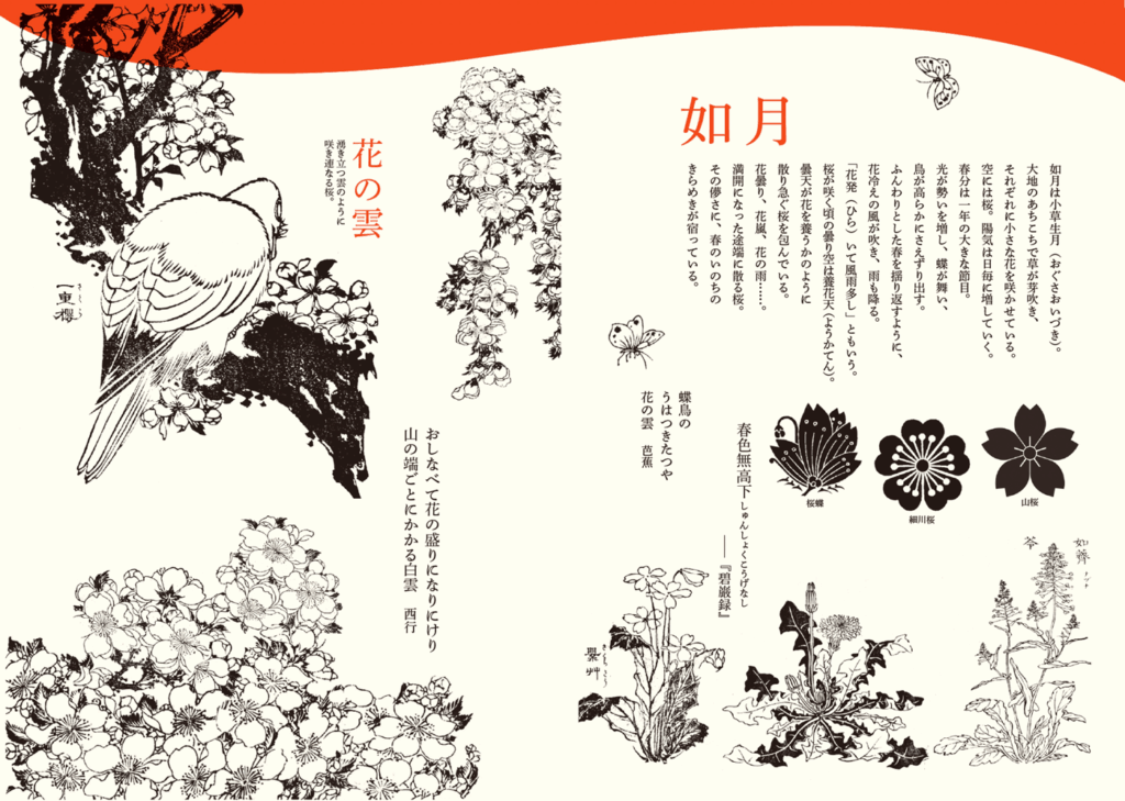 スケジュール帳とは別に、何かに気づき、感じるための手帳としてお使いください。日常の中の実感として、なにかを見たり、感じたり、発見するためのヒントとして図版とコラムを掲載しています。日本人が昔からモチーフにしてきた組み合わせには、自然界の摂理がシンプルに表現されています。