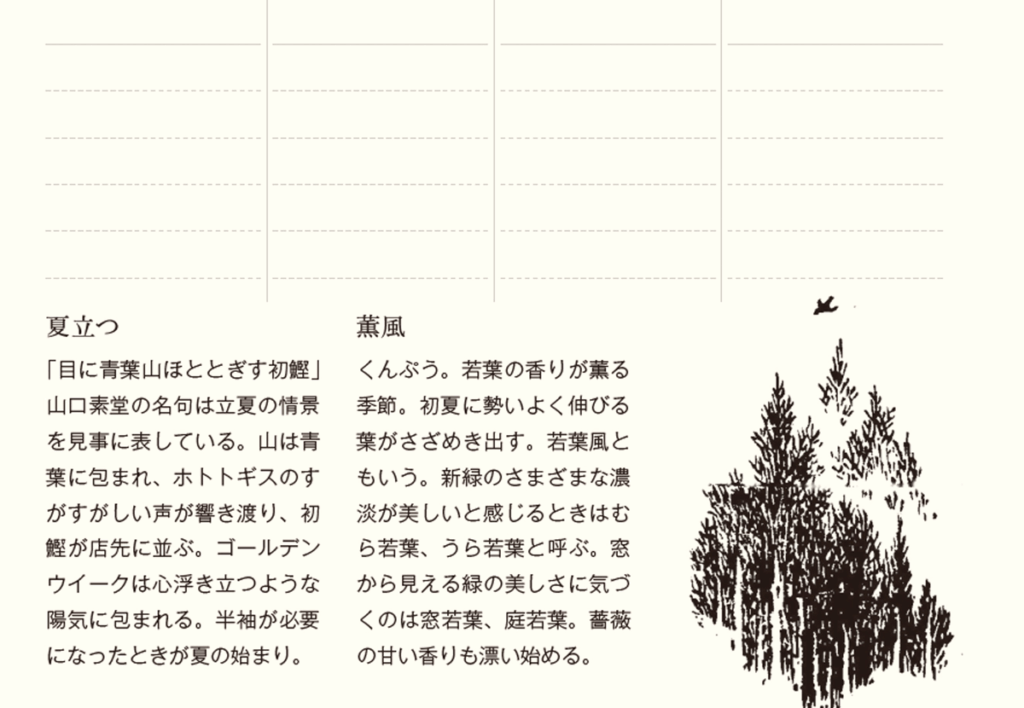 この手帳は、自然や環境に添った暮らしをめざす方々や日本人の風土に根ざした暮らしに関心を持って下さる方々に、「自然のリズムを感じるためのツールになれば」という思いから生まれました。